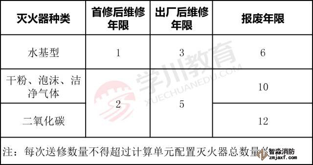 水基型滅火器的報廢年限為6年;干粉滅火器和潔凈氣體滅火器的報廢年限為10年;二氧化碳滅火器的報廢年限為12年。